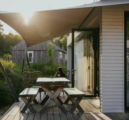 De vele ramen rondom geven je binnen het echte buitengevoel. Ontspan op de overdekte veranda of aan de picknicktafel. Ontwaak heerlijk met het zonnetje en een goede koffie, de kinderen spelen voor de deur in de speeltuin. Kom helemaal tot rust en maak gratis gebruik van onze saunafaciliteiten.